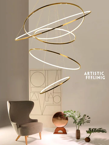 Illuminate your space with the sophisticated elegance of our Golden LED 5-Ring Modern Chandelier. This stunning chandelier features five minimalist rings in a luxurious gold finish, each embedded with energy-efficient LED lights that cast a soft, warm glow. Perfect for contemporary interiors, the sleek design adds a touch of modern glamour to any living room, dining area, or entryway. With its stylish aesthetic and innovative lighting, this chandelier is the perfect statement piece for your home or office. Elevate your décor with this blend of beauty and function.